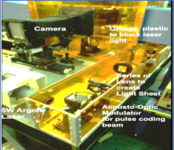 I also used 10W Argon continuous-beam lasers with acousto-optic modulators to pulse-code the beam. To visualize particle flows near light-scattering surfaces, I used polystyrene particles doped with Rhodamine 6G as tracers; holographic notch filters to block the 488 nm and 514 nm Argon lines and pass the orange-red broad spectrum fluorescent emission from Rhodamine 6G into a high-speed camera. |